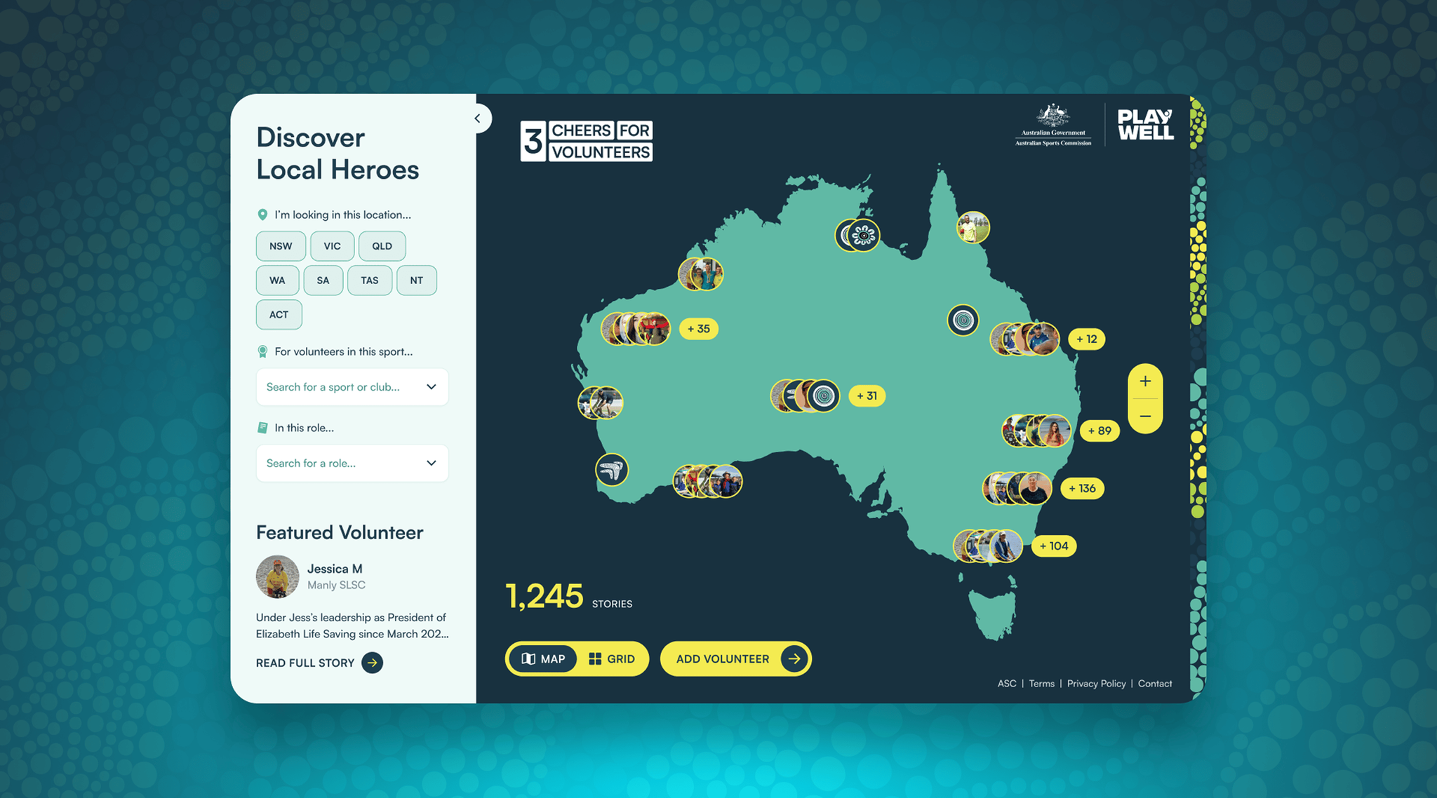 In celebration of National Volunteer Week, DIJGTAL partnered with the Australian Sports Commission (ASC) to design and develop an interactive volunteer map. The project combined creative storytelling with thoughtful UX and front-end execution, empowering clubs and communities to spotlight the unsung heroes who make sport happen across Australia.